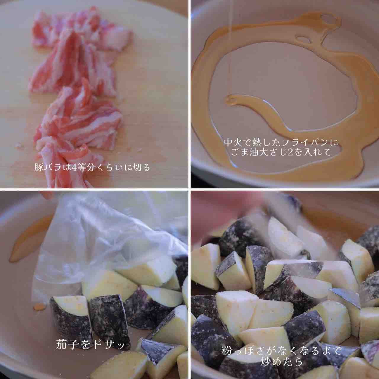 2.ごま油を中火で熱したフライパンで茄子を炒め、粉っぽさがなくなったらフタをして3分蒸す。