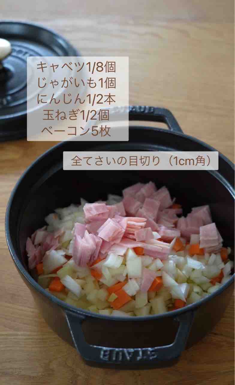 1.Aの具は全てさいの目切り(1cm角)に切って厚手の鍋に入れる。