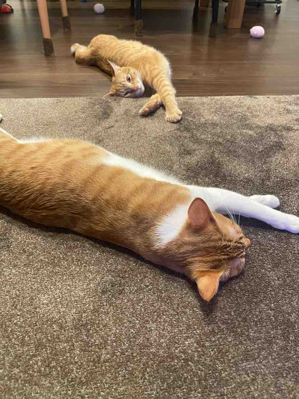 年越しも子供たちは不在、夫は爆睡だったので、私1人で羽根を伸ばしてリビングでゴロゴロしながらビールを飲んでいたんだけど、振り返るとニャンズものびのびゴロゴロ。