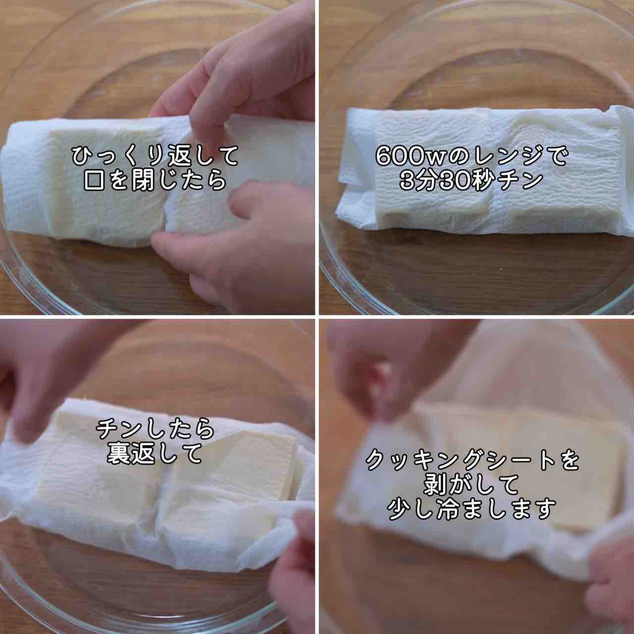 1.レンジ対応の耐熱皿にキッチンペーパーを2枚重ねて置き、豆腐を置いて包んだら裏返して閉じ口を下にしてレンジ(600w)で3分30秒加熱する。