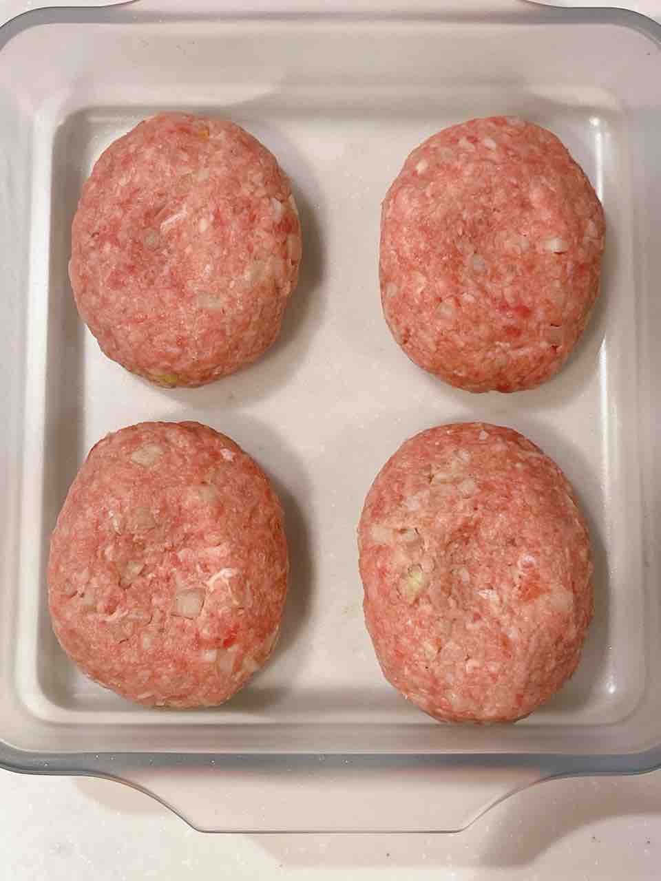 1.ボウルでAをよく混ぜ、4等分にして成形しレンジ対応の耐熱容器に並べる。