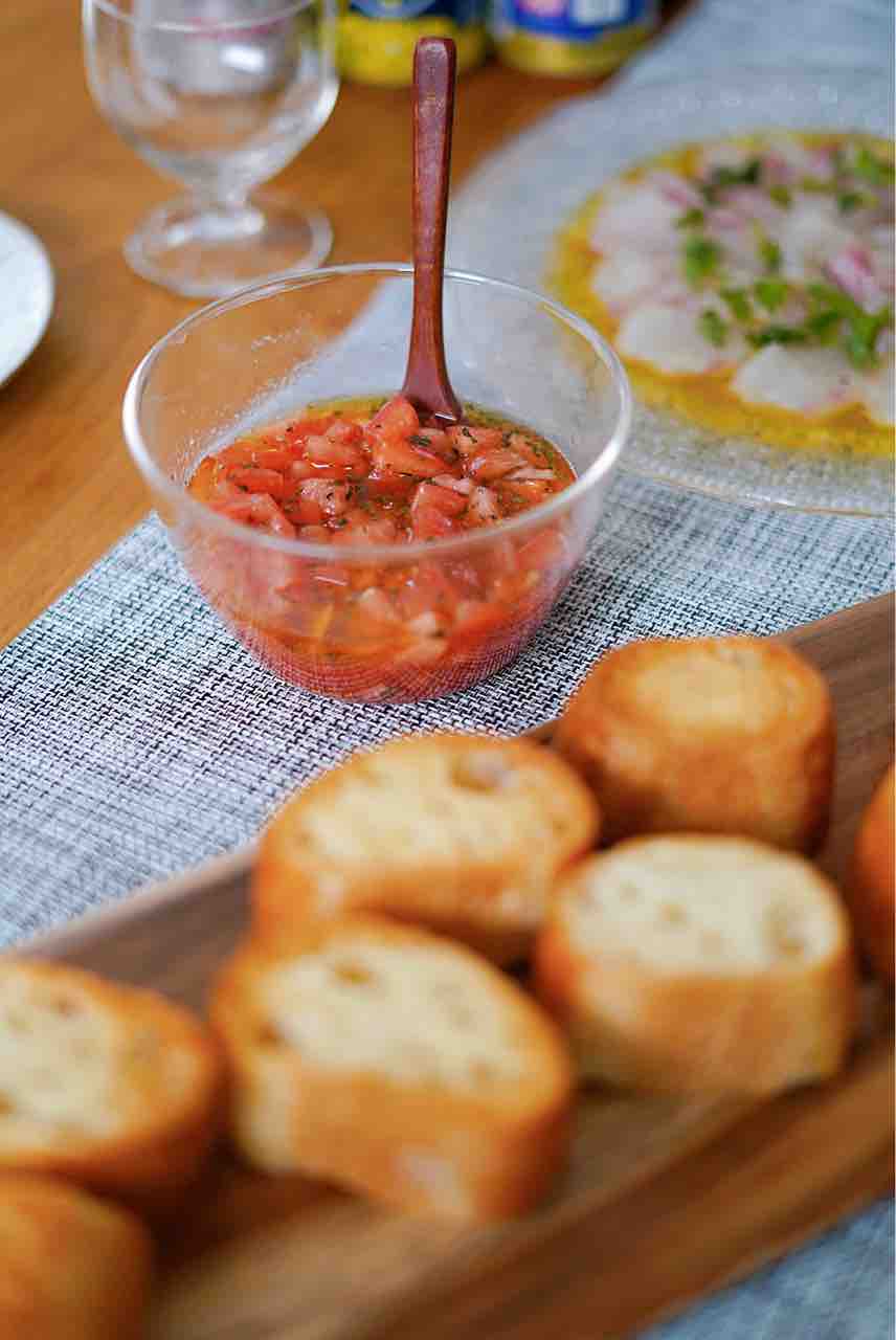 1.バゲットは1~2cm幅に切り、ガーリックバターを塗ってトースターで焼く。