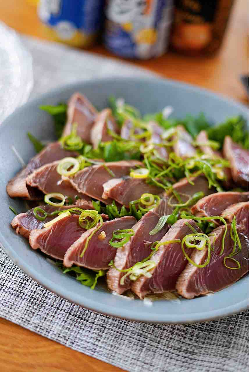 下にスライスして水に晒しておいた玉ねぎを敷いて、カツオのたたきを置いたらポン酢をドバっとかけてます。