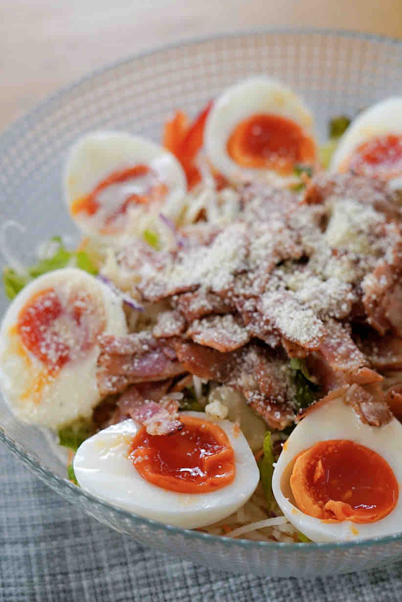 カットサラダをドサッと入れて、カリカリに炒めたベーコンをのせ、ゆで卵を並べたら