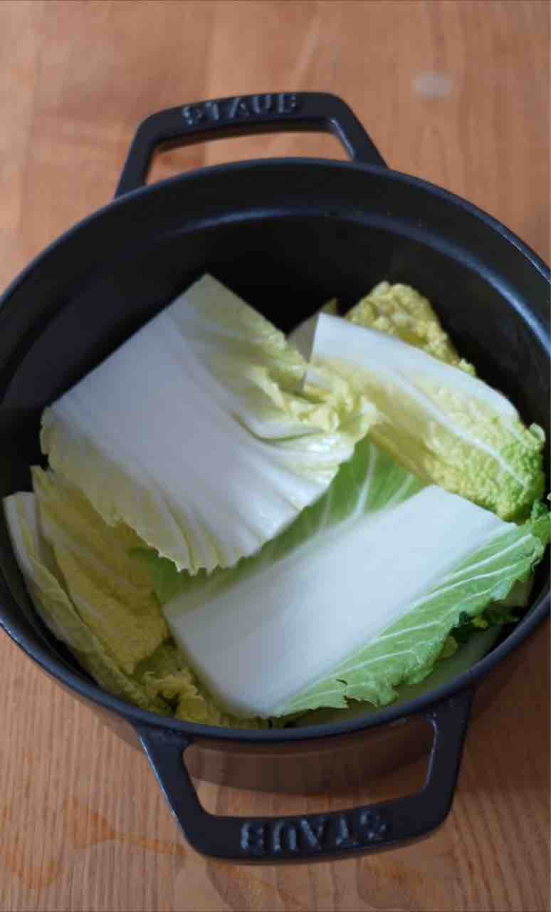 2.白菜は4等分くらいに切り、鍋に半分(芯に近い方)を敷き詰める。