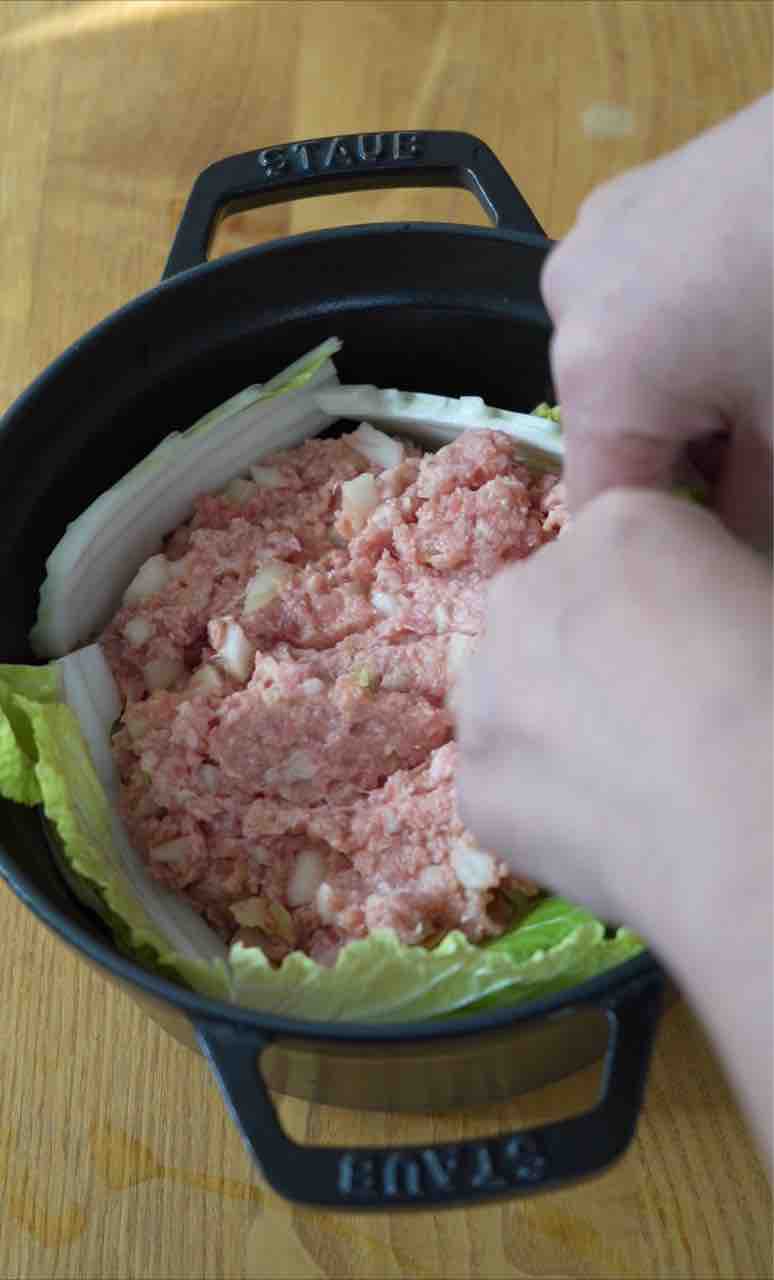 挽き肉にはみじん切りの玉ねぎを使わず、白菜の硬い芯部分をみじん切りにして代用。