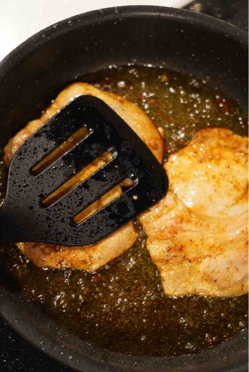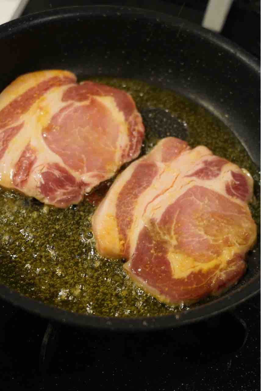 豚肉の筋を切っても焼いているうちに反り返るようならヘラでギュッと押し付けながら焼くと均等に火が通って焼き色も綺麗。