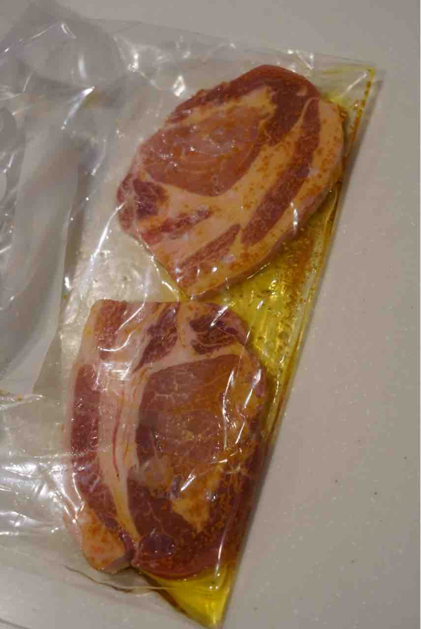 出来るだけコンソメが溶けてからとんかつ用の肉を加えて全体に馴染ませ、口を閉じて冷蔵庫へ。