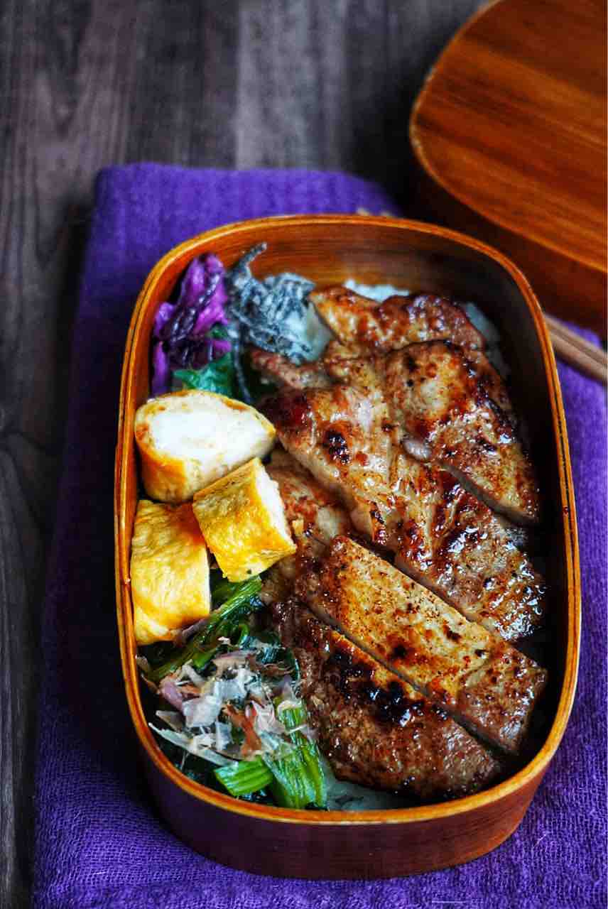 とんかつ用のお肉をコンソメオイルに漬けておいたものを焼いた、コンソメポークソテーのお弁当。
