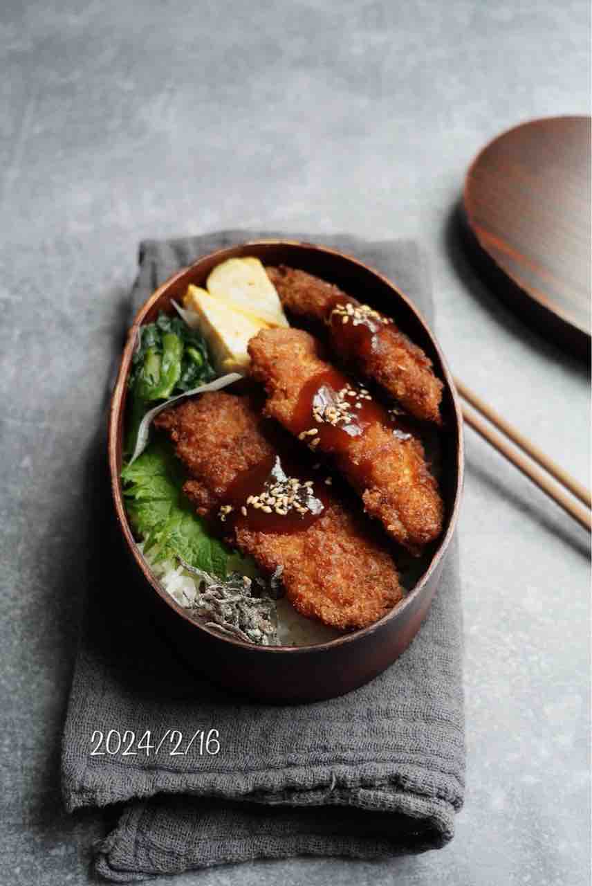 鶏むね肉を薄くそぎ切りにして、醤油と酒2:1に10分ほど漬けておいたものに衣をつけて、めちゃくちゃ少ない油で揚げ焼きに。