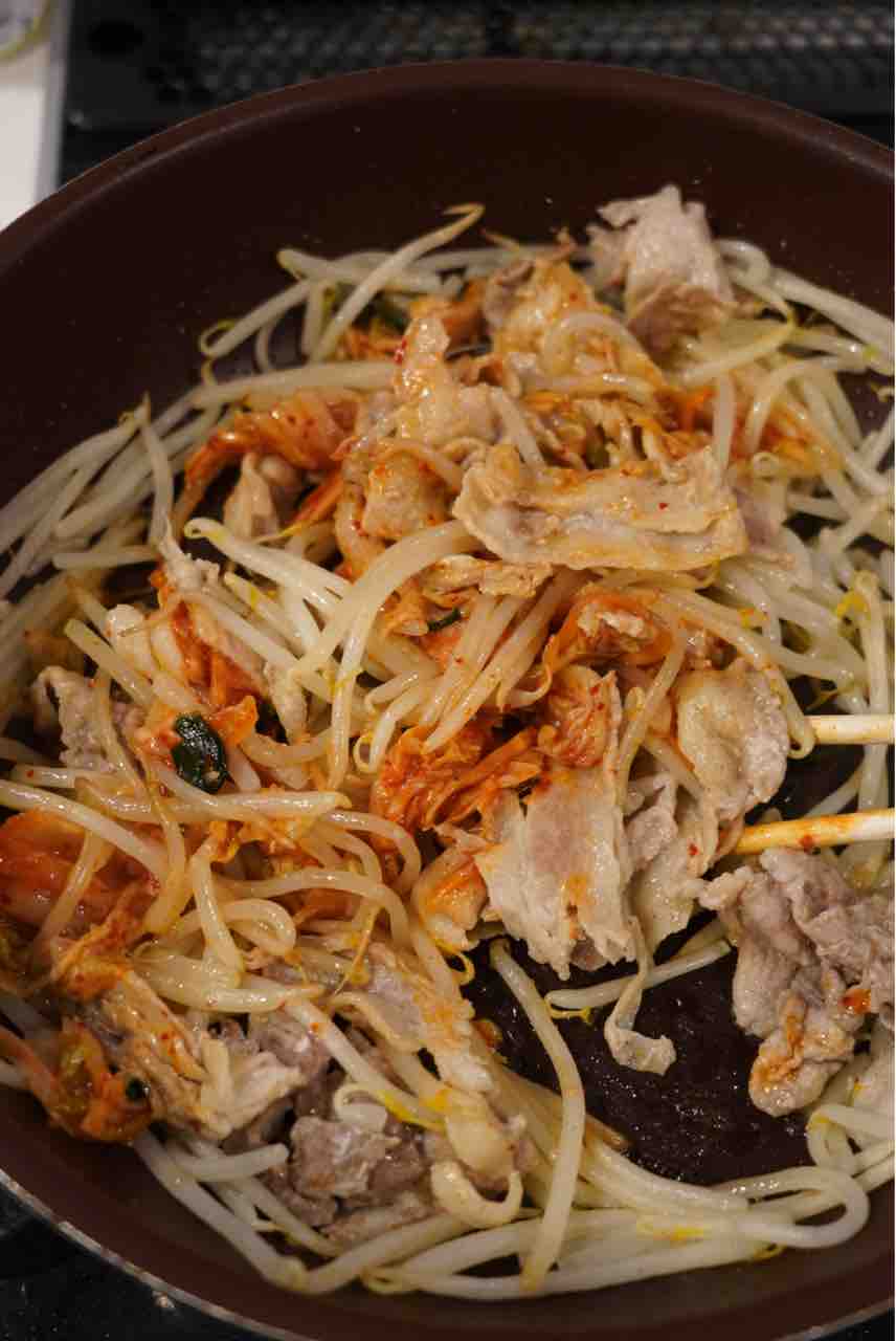 もやしと一緒でもいいし、シナシナになるのが嫌ならキムチたちと一緒でも。