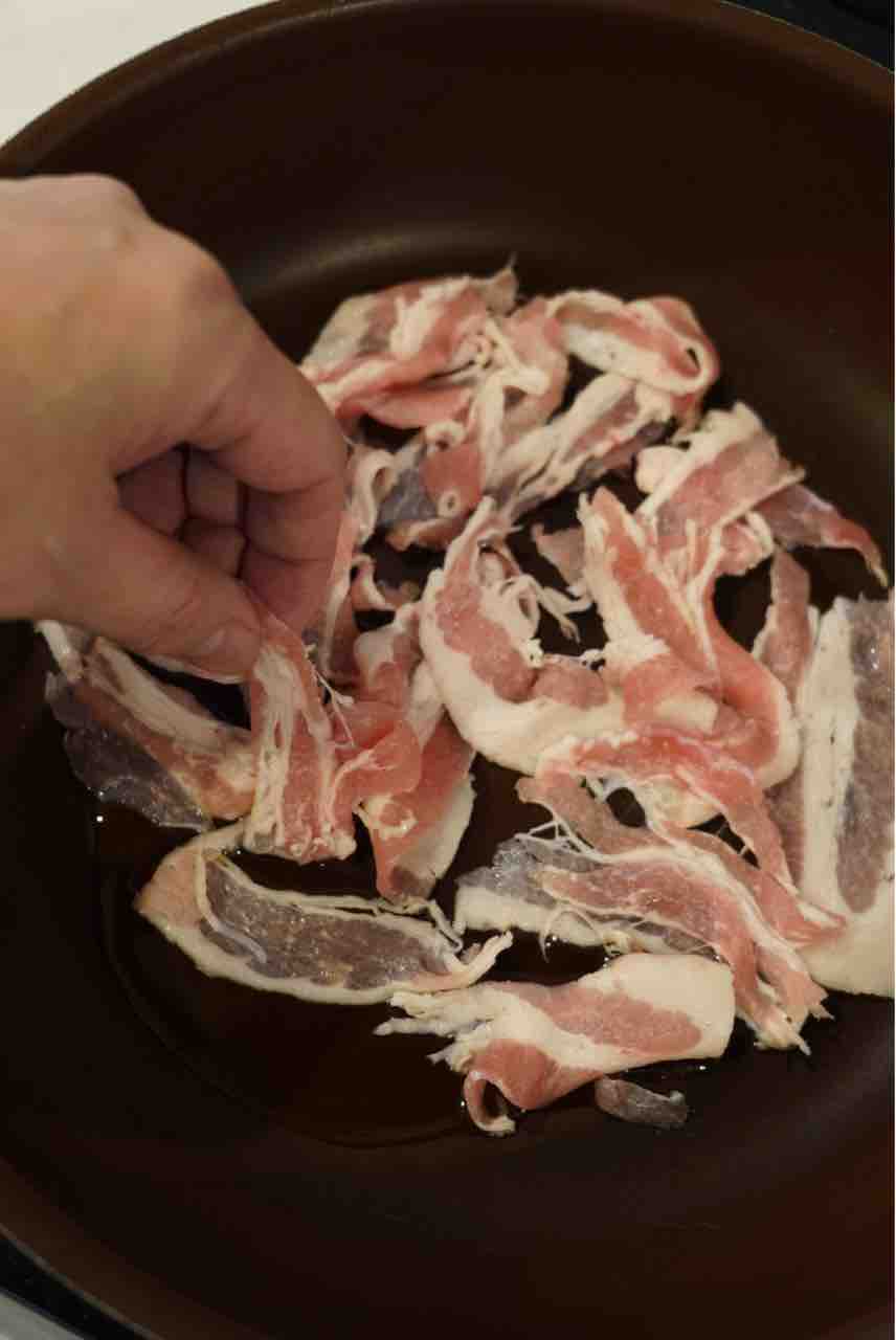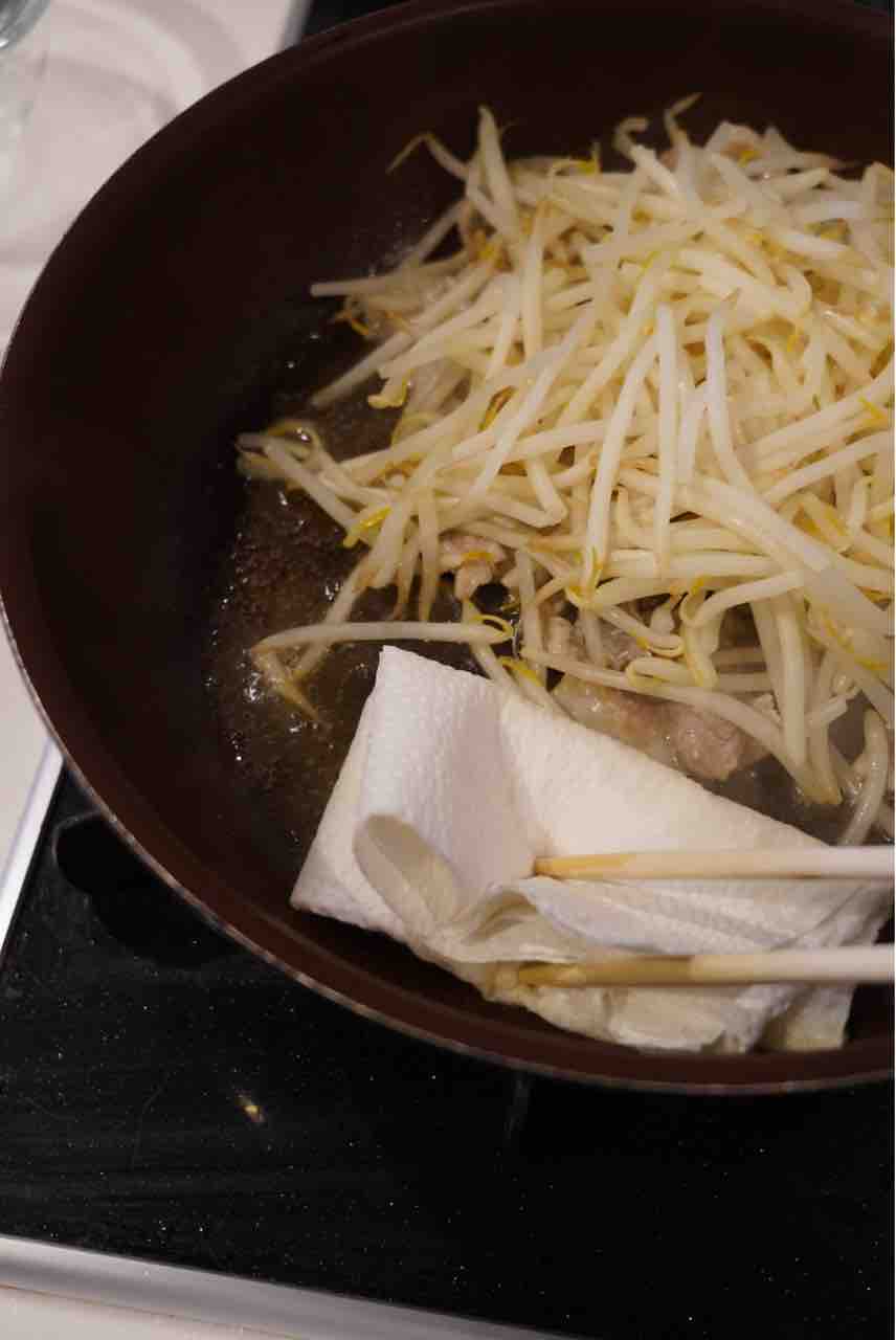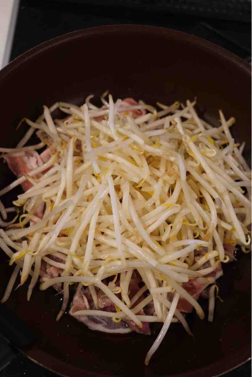 1.ごま油を中火で熱したフライパンに豚バラ肉を並べ、もやしをのせて蓋をし、少し火を弱めて5分蒸し焼きにする。