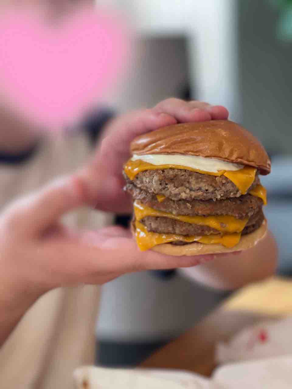 ただでさえ美味しい絶品チーズバーガーのお肉が4枚も!