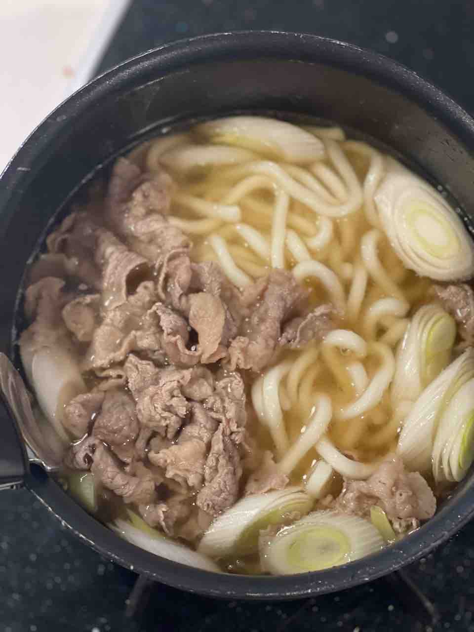 沸騰したら、斜め切りにしたネギ1/4本分と牛こま切れ肉を戻して、3分ほど煮ます。