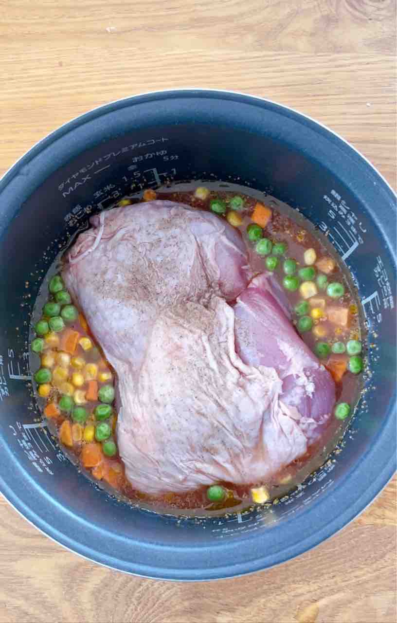 2.ミックスベジタブルを広げてのせ(混ぜないで!)、その上に鶏もも肉をのせて普通に炊飯する。
