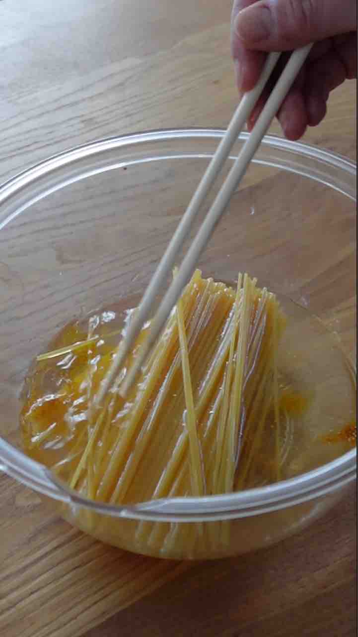 1.大きめのレンジ対応耐熱容器にAを入れ、パスタを折って入れたら全部が水に浸かるようにしてほぐし、ふんわりラップをかけてレンジ(600w)で表記時間+3分加熱する。(倍量の場合は+5分)