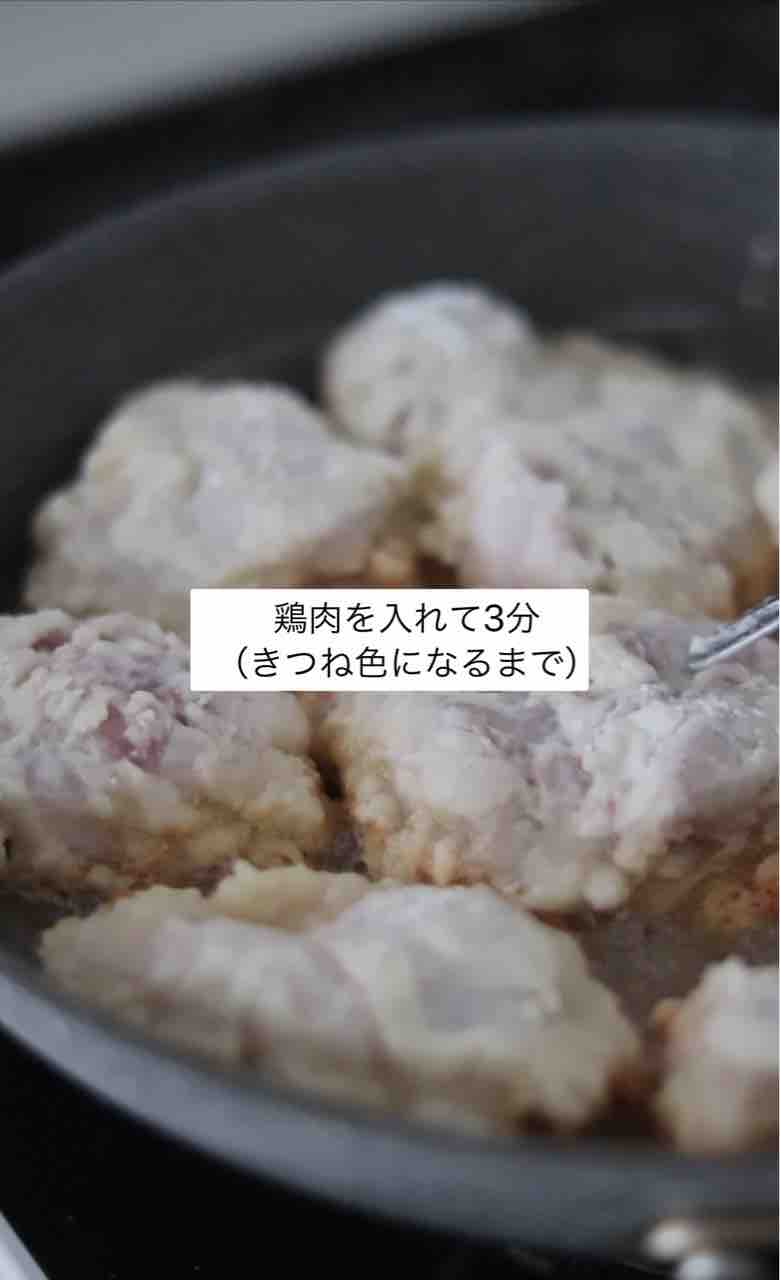 4.鶏肉をBの粉にしっかりとつけてまぶし、フライパンに1cm高さのサラダ油を中火で熱し、鶏肉を並べて片面3~4分ずつ(綺麗な焼き色がつくまで)揚げ焼きにしたらしっかり油を切る。