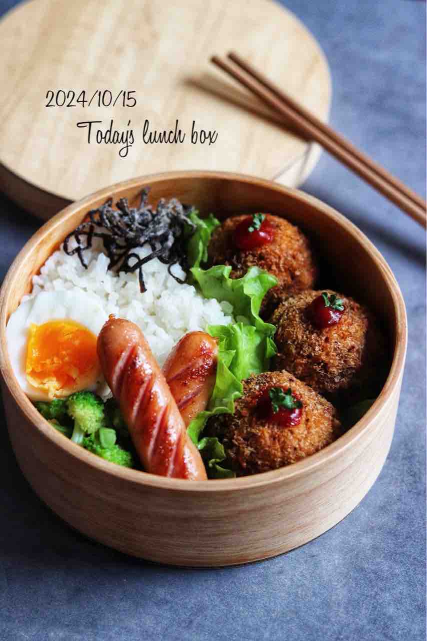丸いおかずを入れる時は丸いお弁当箱に入れると、何となく見た目も入れるのも収まりがいいんだよね。