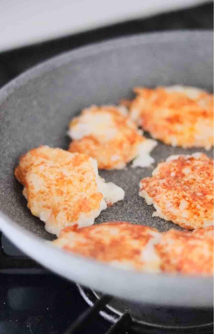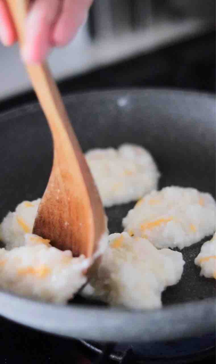 2.1にAを入れてよく揉んだら、サラダ油を中火で熱したフライパンにスプーンで落として両面焼き色がしっかりつくまでよく焼く。(固まるまで触らない!)
