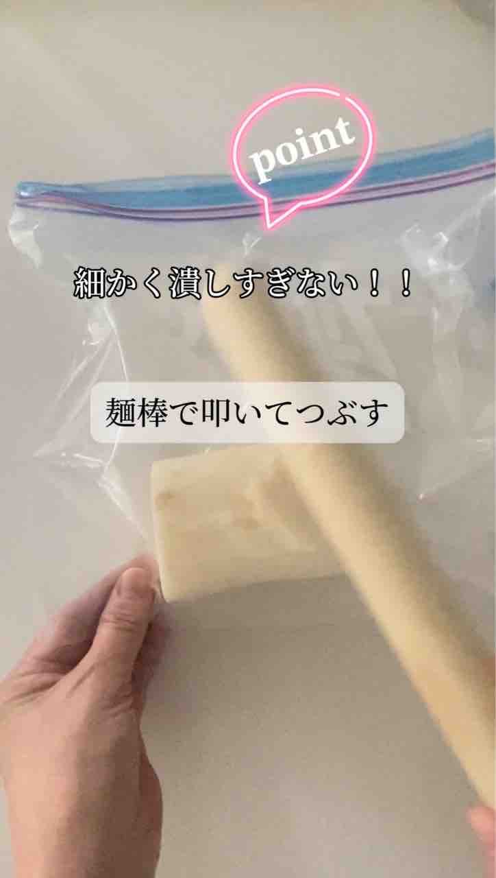 1.厚手の保存袋に長芋を入れて口を閉じたら麺棒でガンガン叩いて砕く。