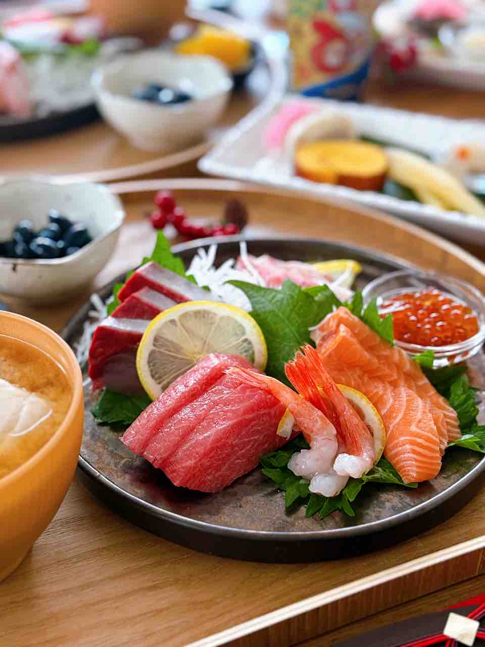 元日は長男がいないのと、おせちはみんな決まったものしか食べてくれないので、食べてくれるものだけをちょこっと盛り付けて、今年もお刺身中心のおせちでした。