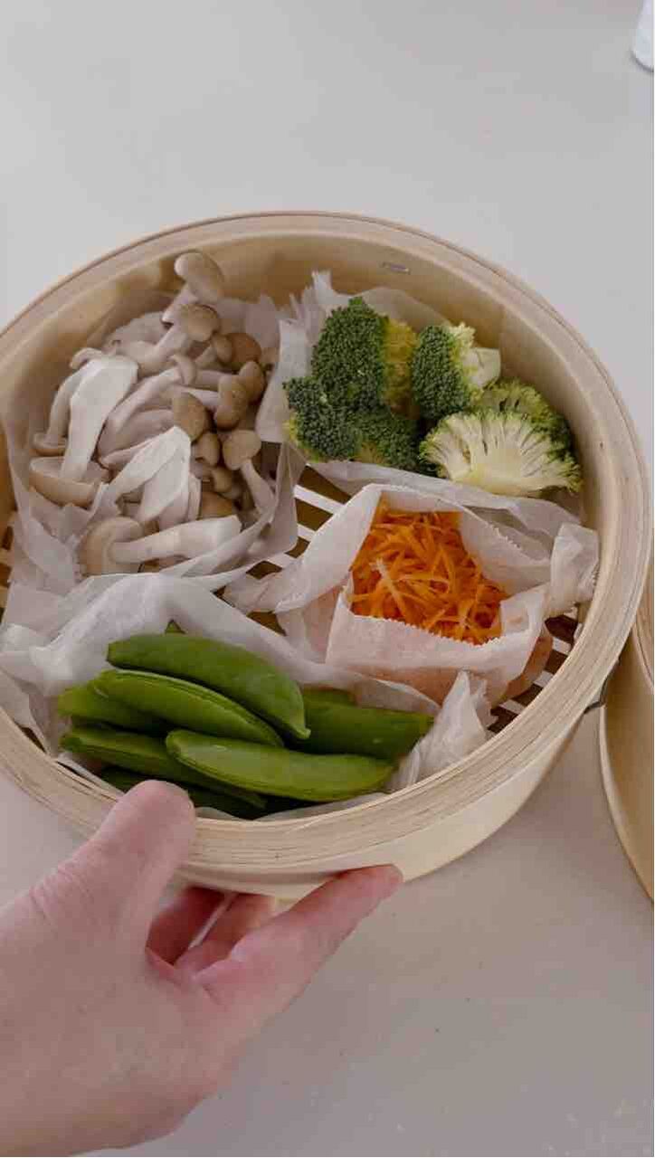 クッキングシートで器を作ってせいろに並べて、余り野菜なんかを入れて。