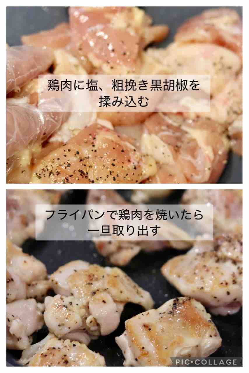 ①鶏肉に【A】を揉み込み、サラダ油大さじ1/2を中火で熱したフライパンに並べて両面焼き色が付くまで焼いたら一旦取り出す。
