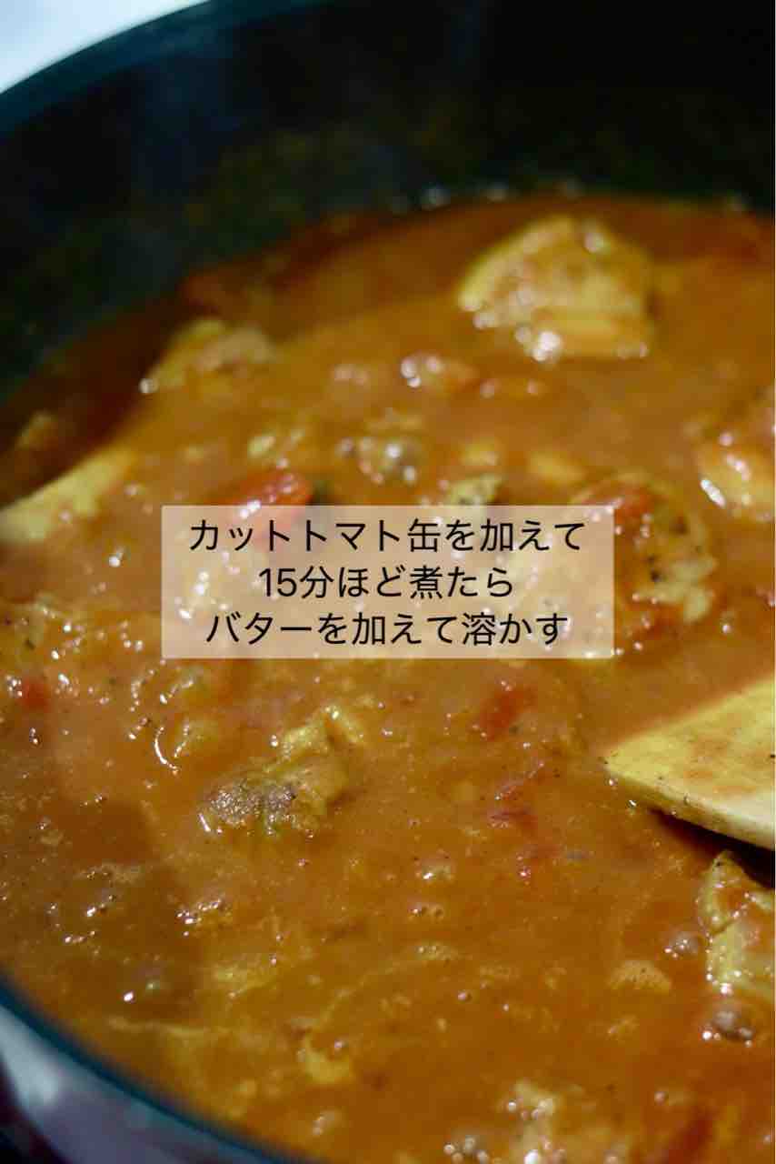 ④トマト缶を加えて15分ほど煮たらバター加えて溶かす。