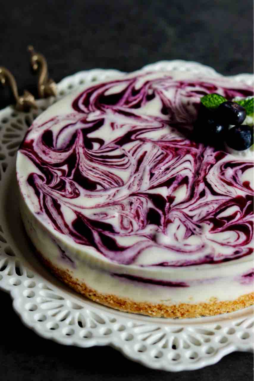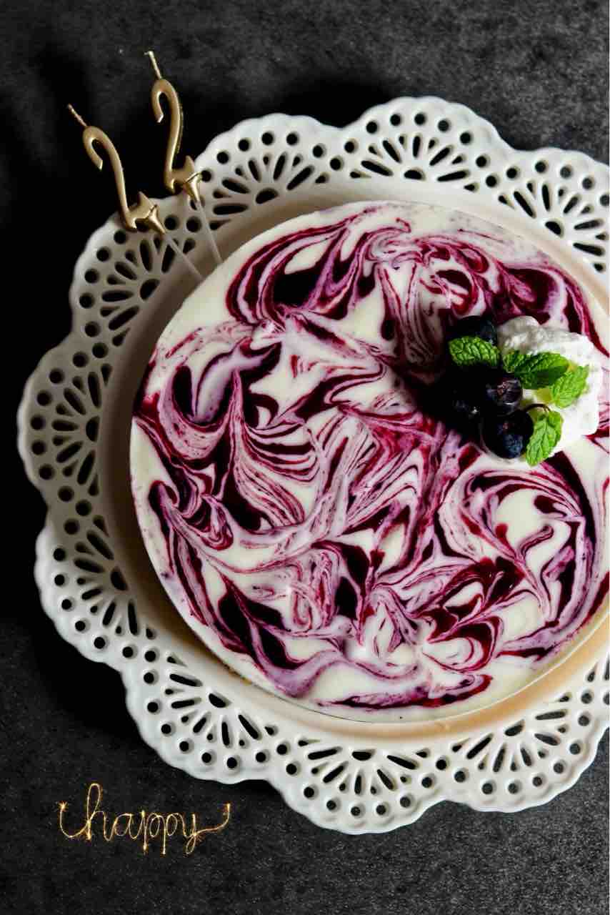 ヨーグルト入のさっぱりしたチーズケーキに、長男も好きなブルーベリーソースをたっぷり2層に、マーブル状にしました。