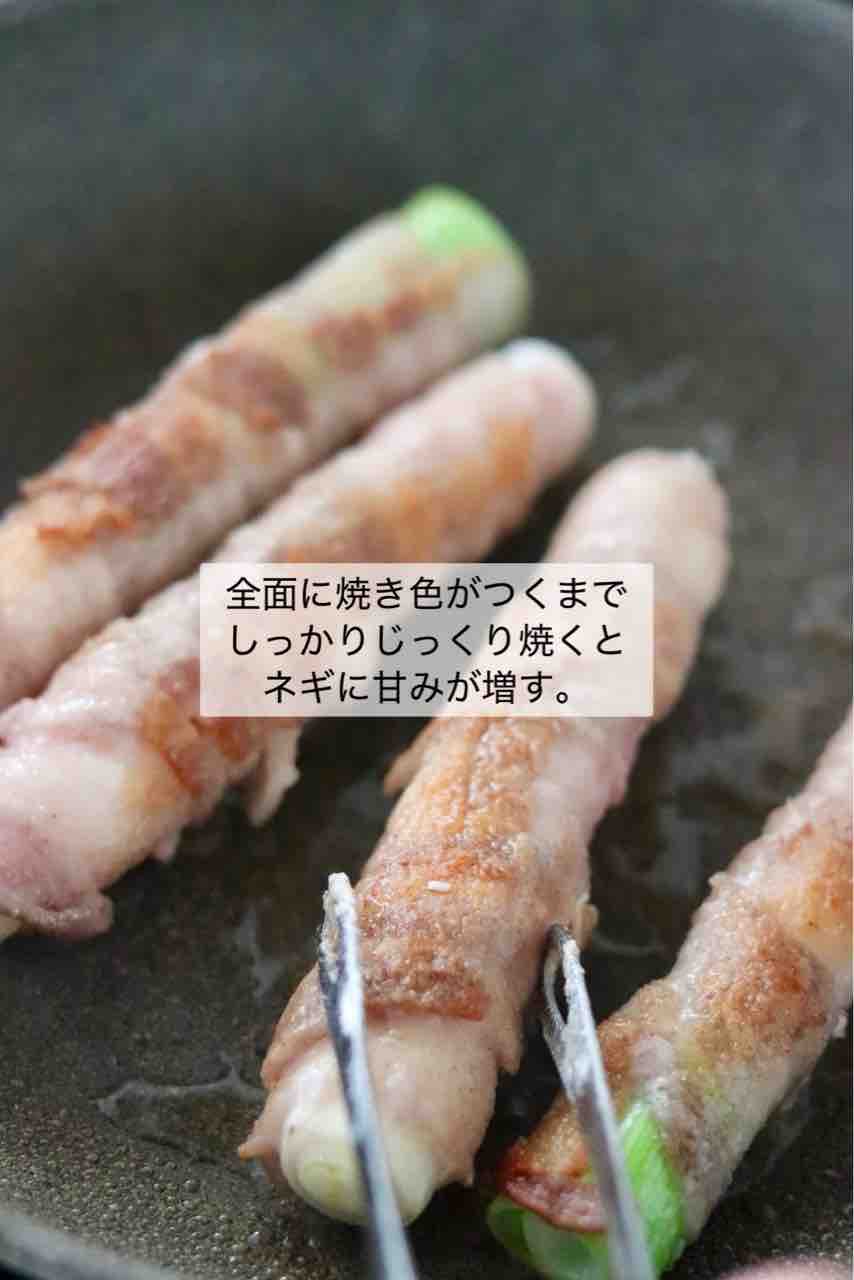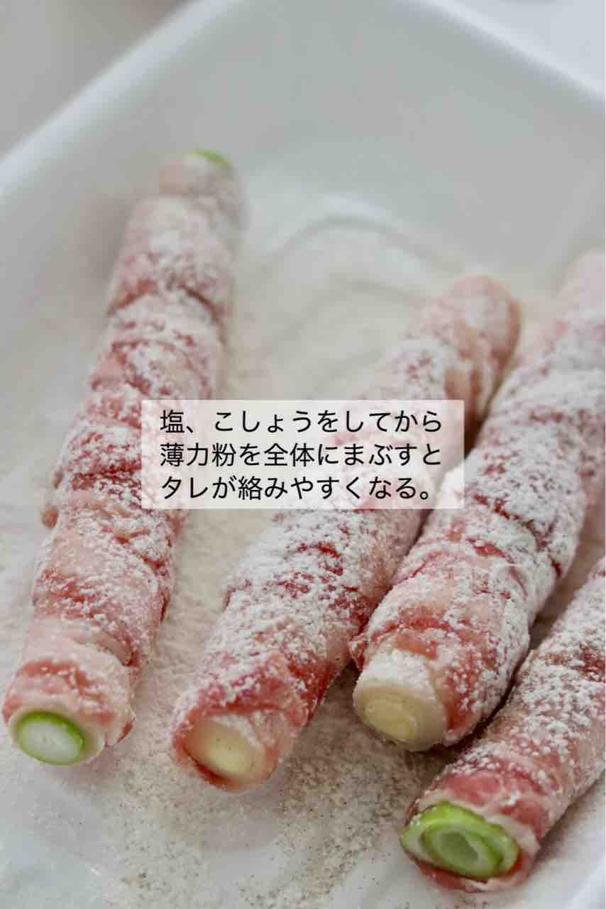 ①ネギに豚バラスライスを巻き付け、ギュッと握って馴染ませたら塩、こしょうを振り、薄力粉をまぶす。