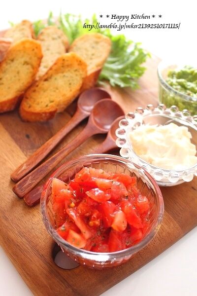 3種類のブルスケッタ【アボカド、クリームチーズ、トマト】 今日は友達が家に遊びに来ていたのでビールのおつまみ的なものを作りました。3種類のトッピングを用意してバケットにガーリックバターを塗って焼いただけなのでレシピというほどではないのですが、実は実は、このアボカドのクリームをずっと作りたいと思い続けて早一か月半 ... 2014/06/11 続きを読む