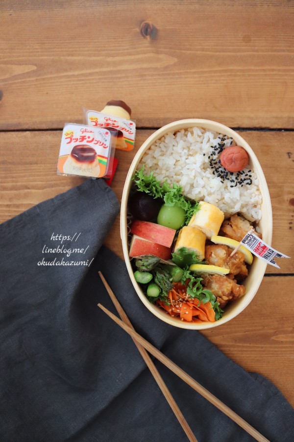 唐揚げ弁当【本日のお弁当】*男のプライド いつもありがとうございます!本日のお弁当*唐揚げ*卵焼き*ひらひらにんじんの麺つゆ蒸し*アスパラバター風味*りんご、ぶどう*ひとくちプッチンプリン*玄米ご飯 今日は次男の運動会ということで、次男のリクエストだった唐揚げを入れたお弁当。と言っても次男は結局 ... 2017/10/11 続きを読む